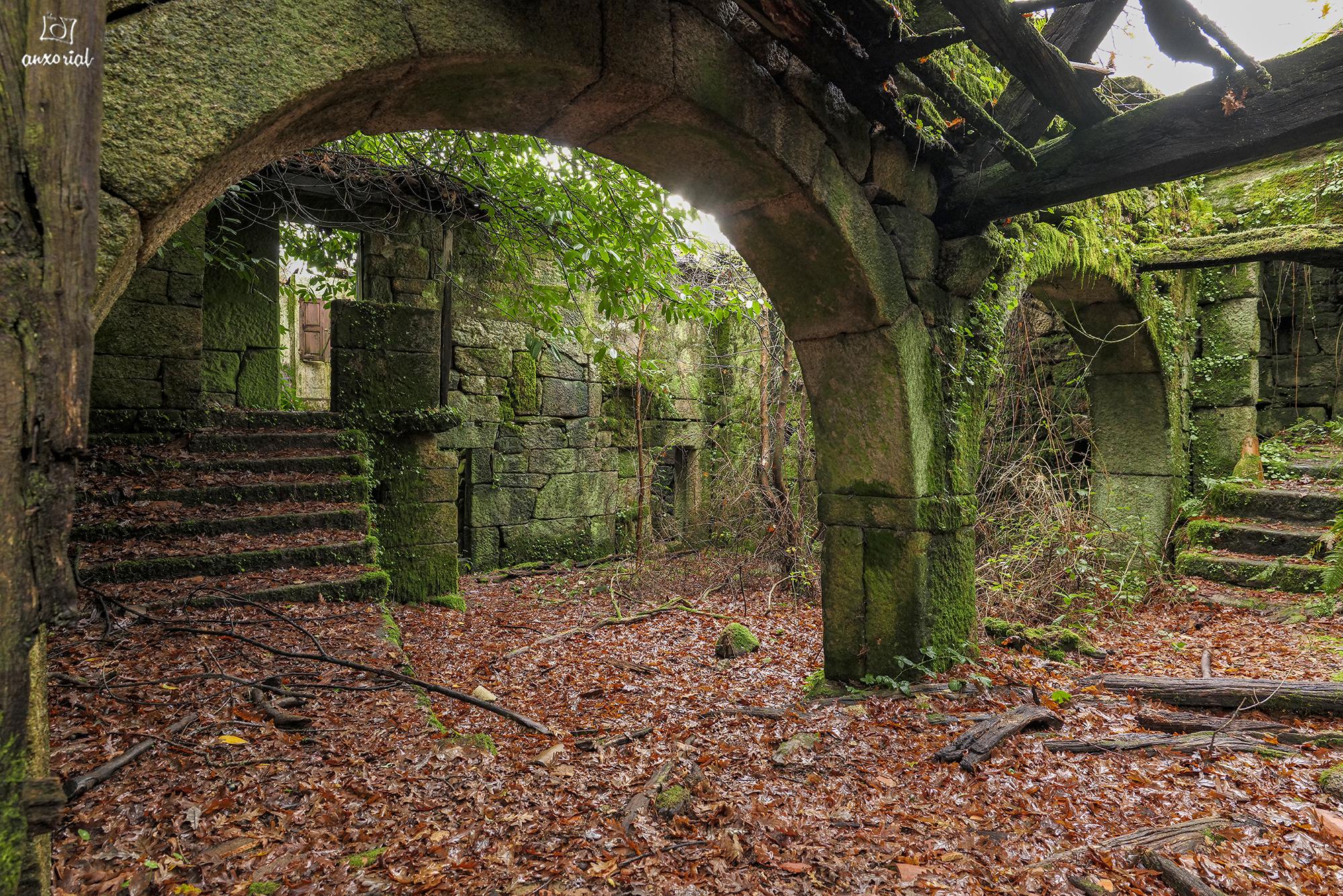El umbral de la fenomenal casa nos avanza un amplio patio, donde un pórtico formado por dos elaborados arcos de medio punto rápidamente acaparan nuestra atención ya que son algo excepcional para una supuesta y humilde casa de campo. A poco que nos fijemos, aparecen también en el horizonte la escalera a la ya inexistente planta superior, los restos de una “lareira” y los huecos de las paredes para albergar los utensilios de la cocina. En la fachada exterior una curiosa ventana con fuertes rejas, alimentan la teoría de reclusión que desempeñaba la casona.